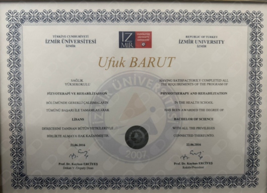 İzmir Üniversitesi Fizyoterapi ve Rehabilitasyon bölümünden 2016 yılında mezun oldum. Lisans eğitimi süresince 20 den fazla kurumda stajyer olarak görev aldım. Osteopati Eğitimi, Mulligan Terapi Eğitimi, Erkek Sağlığı Eğitimi, Kinezyolojik Bantlama Eğitimi, Klinik Pilates Eğitimi ve birçok eğitime daha katılıp sertifika aldım.Lisans eğitimi sonrası Bursaspor, Sportopedi, Özel Gemlik Rehabilitasyon merkezlerinde Fizyoterapist / Baş Fizyoterapist olarak görev aldım. 2018 yılında kendi kliniğimde de danışan kabulüne başladım. 2020 yılından itibaren sadece kendi kliniğimde ortopedik,nörolojik, ürolojik rehabilitasyon alanlarında hizmet vermekteyim.